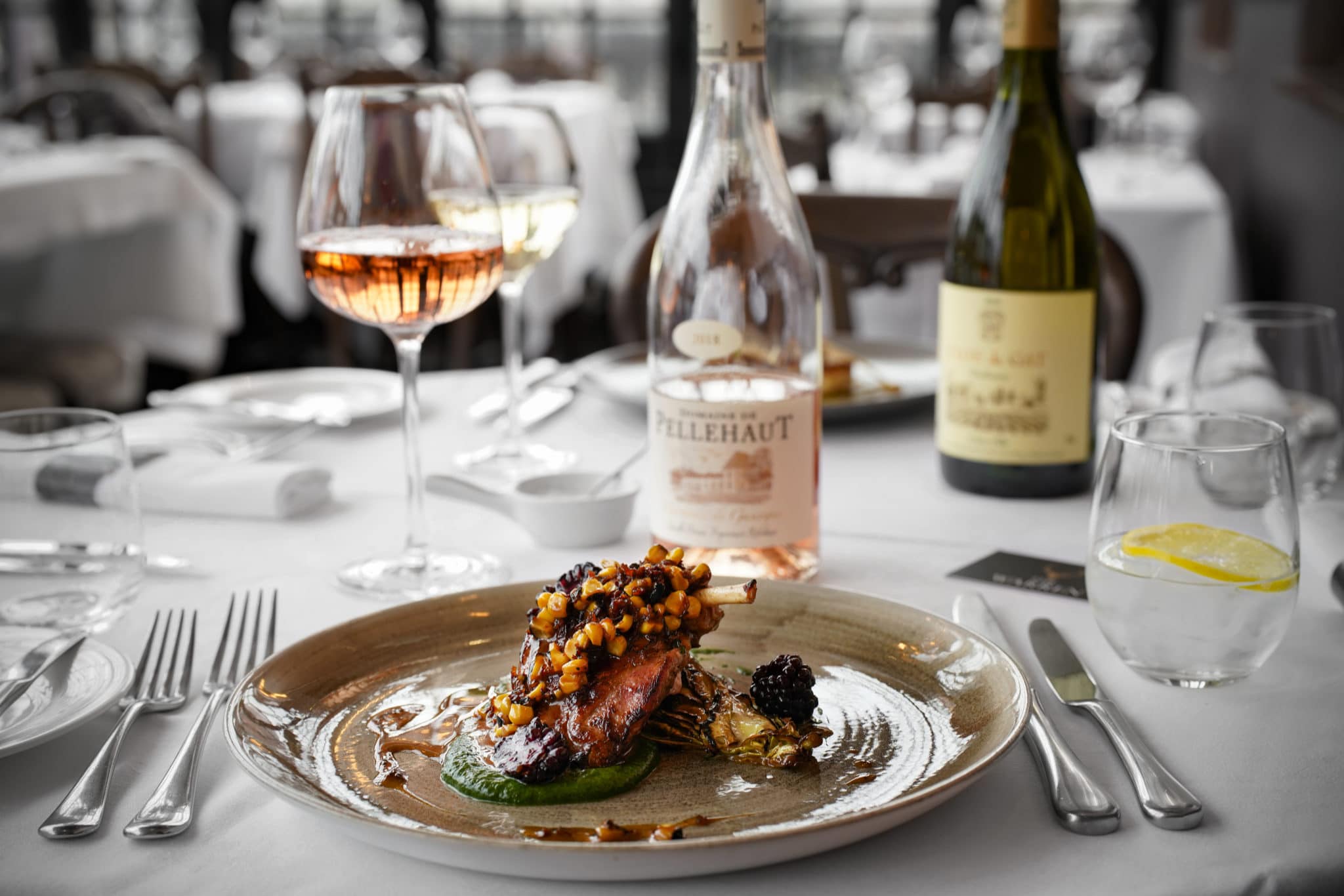 Should you so wish, you can have a pre-starter of Colchester oysters, vinaigrette, lemon and a variety of Tabasco sauces. We decide to go straight to our starters, mine being Coconut Tiger Prawns, chilli and sweetcorn tart and a coriander foam. The prawns have a pleasant taste and I really like the tart, the foam not overpowering the other flavours. Sue has the King Oyster Mushrooms, which can be served as a main dish and enjoys the cauliflower and almond purees, the textures of which are excellent. The chilli sauce leaves a nice warmth on the palate. There are currently two vegan starters, the latter and Plant Based Feta Salad, with beetroot, pear, apple, hazelnuts and almonds. Magdalena kindly offers us a glass of the Busi Jacobsohn Rose Extra Brut 2018, equally as good as the classic. With our main courses of Pan Seared Duck Breast and Braised Rump of Lamb, Magdalena recommends a Saint-Emilion Grand Cru, Chateau Eglise d’Armens 2018. A brilliant pairing.